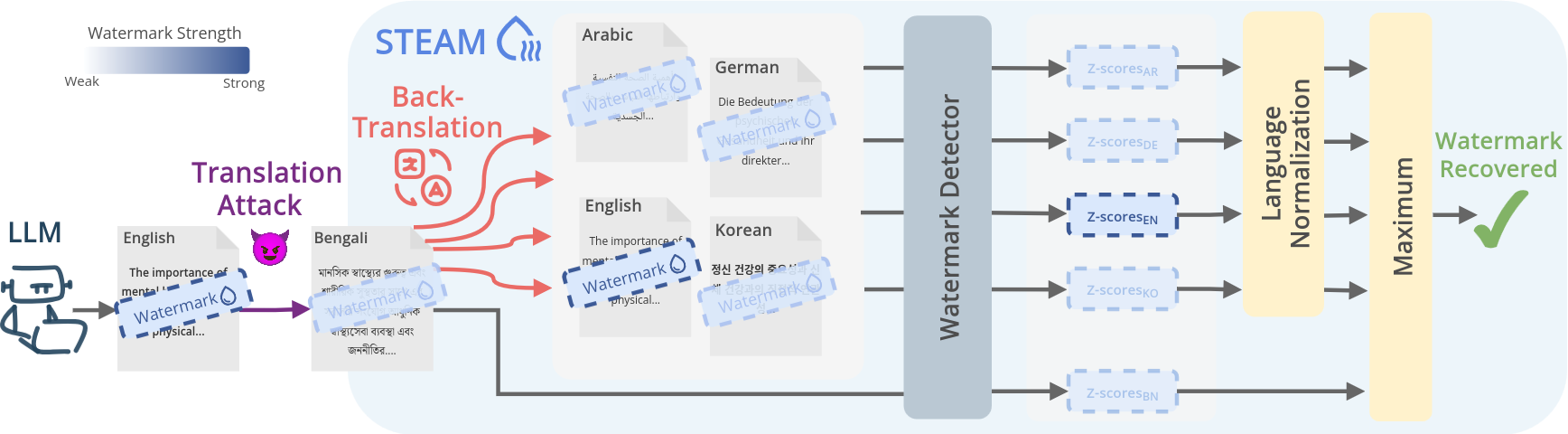 Multilingual watermarking aims to make large language model (LLM) outputs traceable across languages, yet current methods still fall short. Despite claims of cross-lingual robustness, they are evaluated only on high-resource languages. We show that existing multilingual watermarking methods are not truly multilingual: they fail to remain robust under translation attacks in medium- and low-resource languages. We trace this failure to semantic clustering, which fails when the tokenizer vocabulary contains too few full-word tokens for a given language. To address this, we introduce STEAM, a back-translation-based detection method that restores watermark strength lost through translation. STEAM is compatible with any watermarking method, robust across different tokenizers and languages, non-invasive, and easily extendable to new languages. With average gains of +0.19 AUC and +40%p TPR@1% on 17 languages, STEAM provides a simple and robust path toward fairer watermarking across diverse languages.